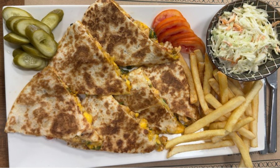 Thinly pounded beef steak, marinated and grilled, served with grilled tomato, green pepper, rice and crispy fries.