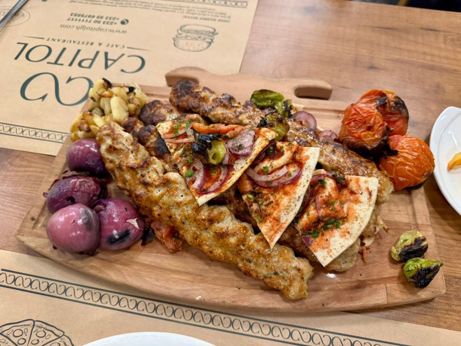 Grilled minced beef and lamb served with jollof or fried rice, grilled tomatoes and green pepper, sliced and spicy onion, and fried potatoes.