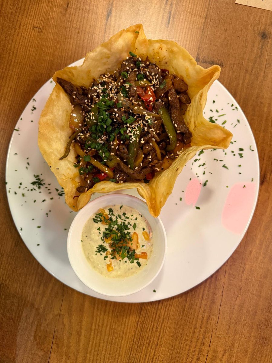 Tender lamb shoulder, slowly cooked to perfection. Served with rice, potato fries, and salad. Rich, traditional and deeply satisfying.