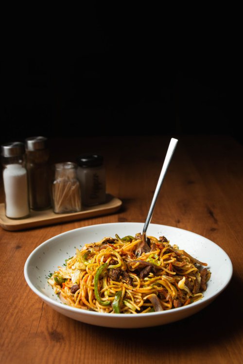 Beef chunks with tomato, onion and green pepper. Served with jollof or fried rice, and fried potatoes.