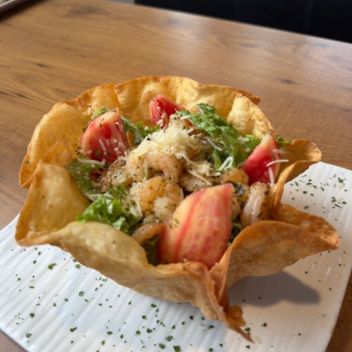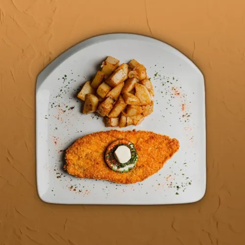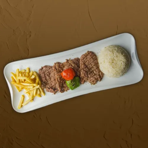 Thinly pounded beef steak, marinated and grilled, served with grilled tomato, green pepper, rice and crispy fries.