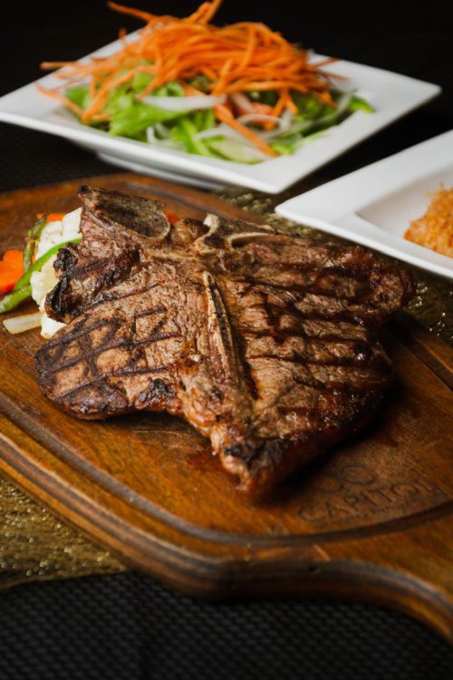 Sliced grilled steak, salt, black peppercorns. Served with mashed or fried potatoes, and jollof or fried rice.