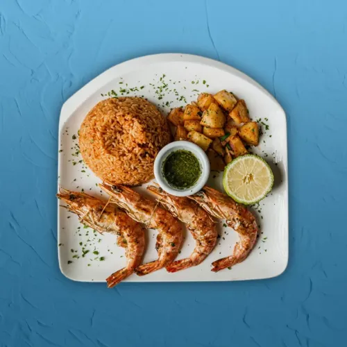 Grilled minced beef and lamb served with jollof or fried rice, grilled tomatoes and green pepper, sliced and spicy onion, and fried potatoes.
