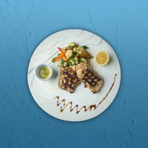 Grilled lamb chops served with jollof or fried rice, grilled tomatoes and green peppers and fried potatoes.