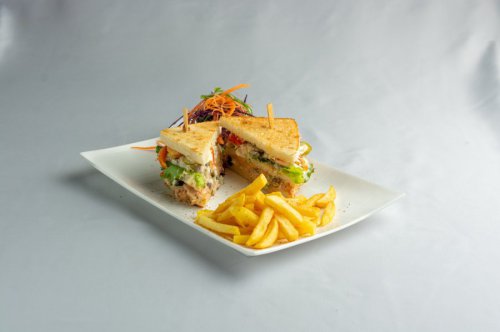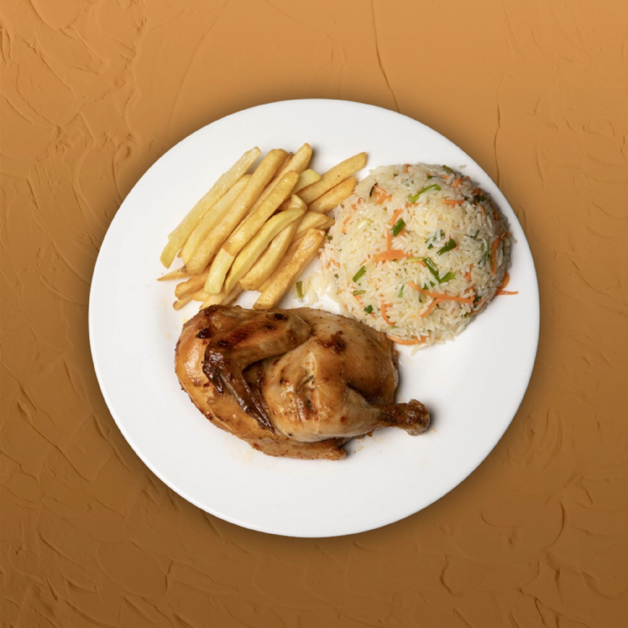 Thinly pounded beef steak, marinated and grilled, served with grilled tomato, green pepper, rice and crispy fries.