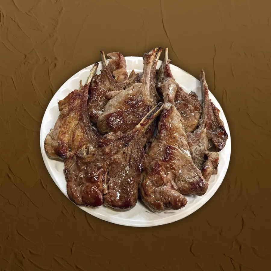 Grilled lamb chops served with jollof or fried rice, grilled tomatoes and green peppers and fried potatoes.