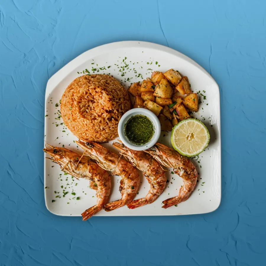 Grilled lamb chunks with tomato, onion and green pepper. Served with jollof or fried rice, and fried potatoes.